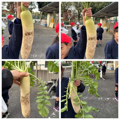 子ども達にとって、青々とした葉がついた大根を見る機会も少なく、また両手で持たなければ重くて持てないような立派な大根に驚きと喜びがありました。