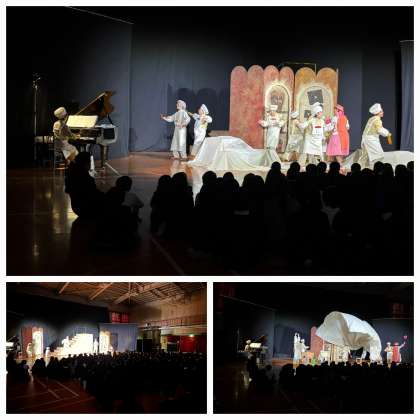 今回もピアノの生演奏と歌でおはなしを進めていくスタイルでの公演で、体育館がオペラハウスに大変身!