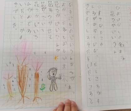 ノートにまとめたものを手に、班の友だちに好きなお話しを紹介しました。