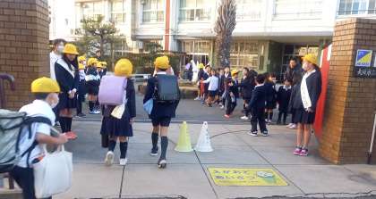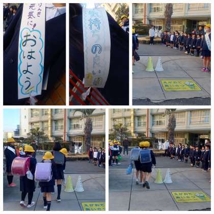 6年生の代表委員の声掛けで、低学年があいさつ運動に参加しました。