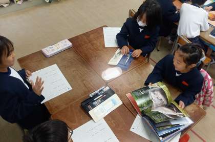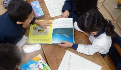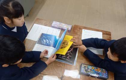 いろいろな動物について紹介されている本を見て、どの動物について調べるのかを決めています。