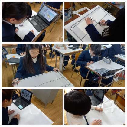 1年間の作品を持ち帰るための「作品袋」に、好きな絵を描いています。