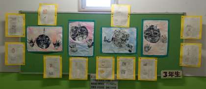 鬼の版画の周りには、昔の道具についての説明が掲示されています。
