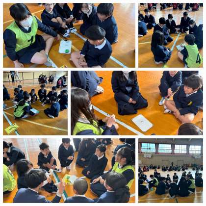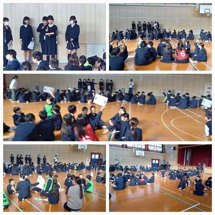 たてわり班で相談して3択から答えを選び、ホワイトボードにかいています。
