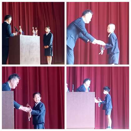 ひらちゃん読者ノート達成者、図書ボランティアさん、読書の木に多くの葉を繁らせた学級に対して、表彰状やトロフィーを手渡していただきました。