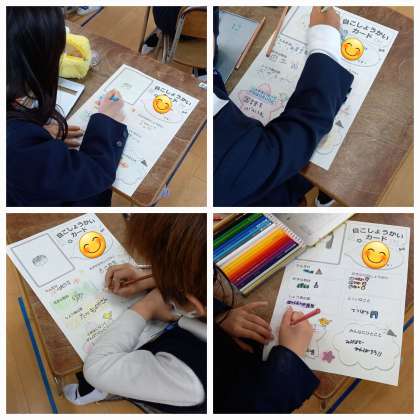 友だちや先生に自分のことを知ってもらうために、自己紹介カードをかいています。