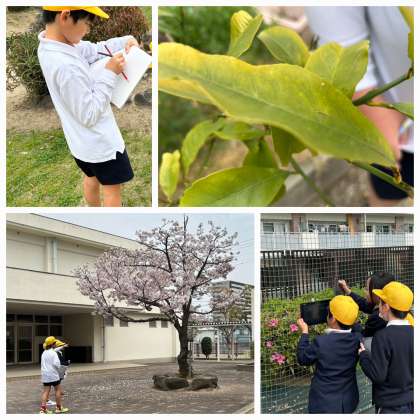 ノートに絵を描いたり、タブレット端末で撮影したり、春の動植物の様子について学んでいます。