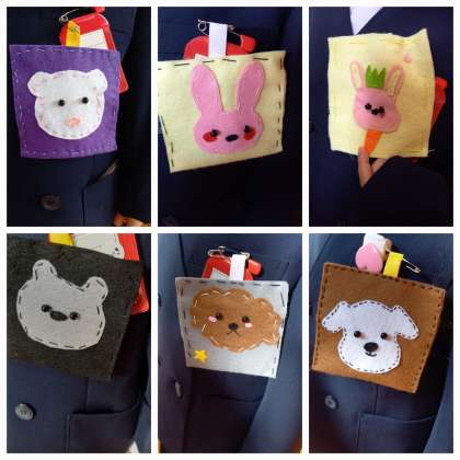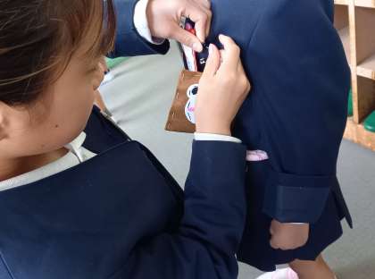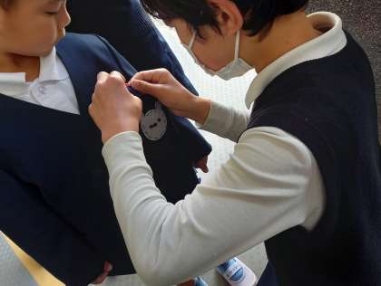 新6年生が、心を込めて手作りした「ワッペン」に、にっこり笑顔の1年生(^-^)