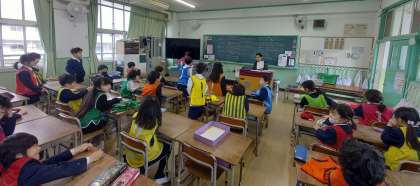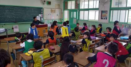 2年生が、学校たんけんに向けて活動班ごとに色の違うビブスを着て、案内する部屋の説明を覚えたり、1年生の名前を確認したりしています。