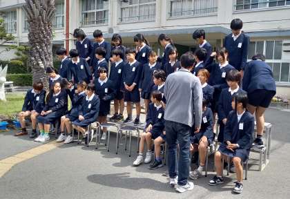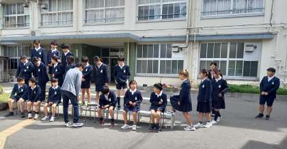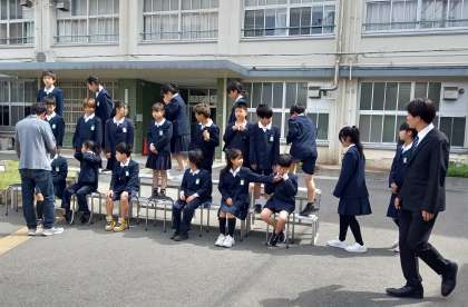 晴天のもと、1年1組から順に学級写真撮影を行いました。