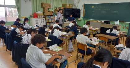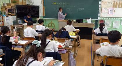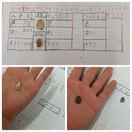 ヘチマ・ヒョウタン・ツルレイシの種を手にし、色や形、手ざわりなどをノートに記録しています。