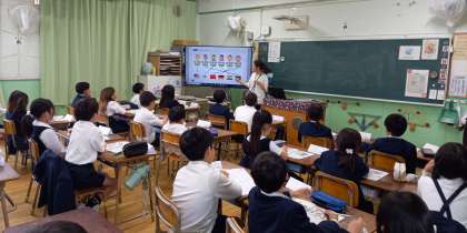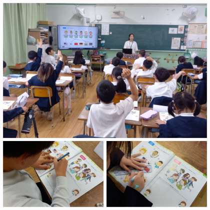 世界のいろいろな国のあいさつを聞き、その国の国旗を選んでいます。