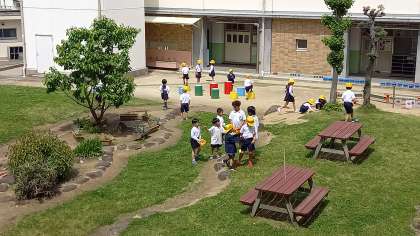 緑鮮やかな「うりひガーデン」では、1年生を誘っていろいろな学年の子ども達が楽しく遊んでいます(^-^)