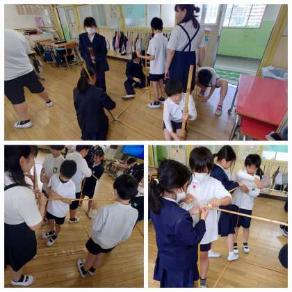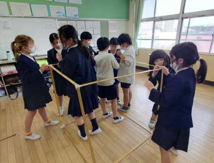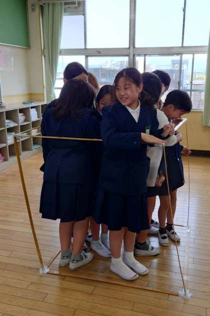 1メートルものさしとテープを使って、みんなで協力して「1立方メートル」を作っています。