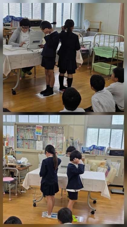保健室では、子ども達がオージオメーター(様々な音量・周波数の音が出ます)を使って聴力検査をしています。