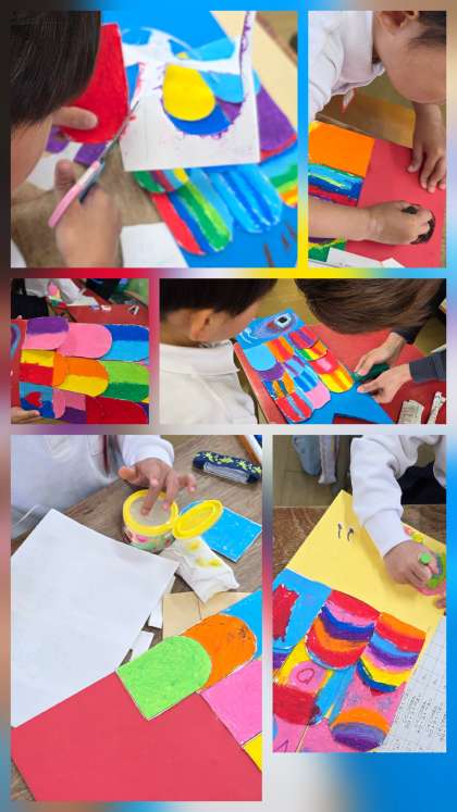 ハサミで切ったうろこにパスで色を塗り、こいのぼりを作っています。