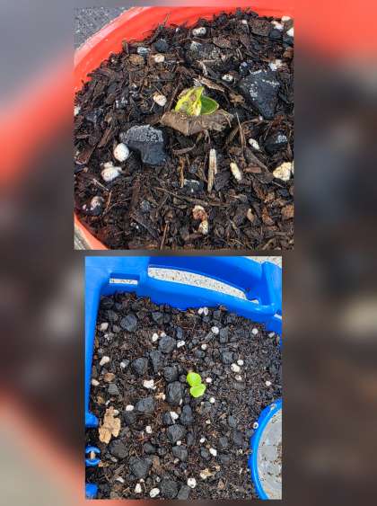3年生が育てているヘチマとホウセンカに小さな芽が出ているのを見つけました。