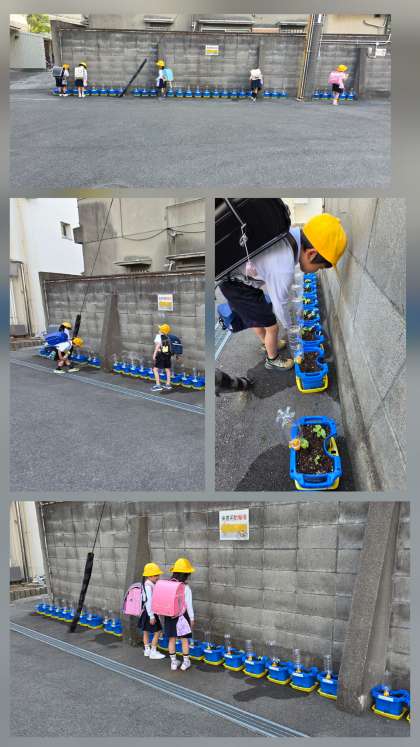 1年生は登校すると、玄関近くのアサガオの鉢を観察しています。