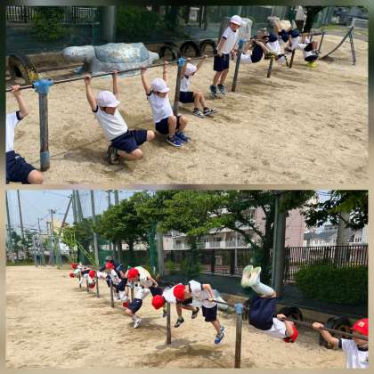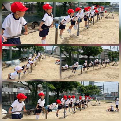 鉄棒を使った運動遊びは、支持、ぶら下がり、振動、跳び上がりや跳び下り、易しい回転などの基本的な動きを身に付けながら、簡単な遊び方を工夫したり、考えたことを友達に伝えたりする学習です。