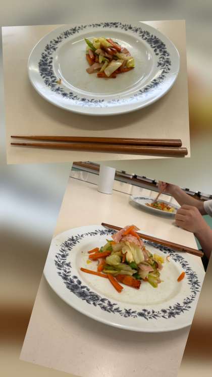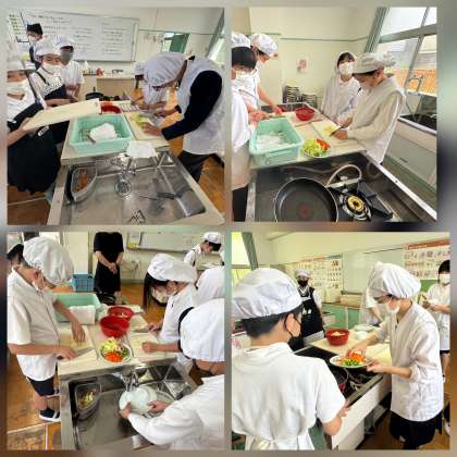 「班で協力して手早くおいしい野菜いためを作ろう」をめあてに調理実習をしました。