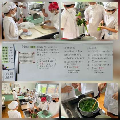 今日の調理実習のめあては「ほうれんそうとじゃがいものゆで方のちがいに気をつけておいしいおひたしとゆでいもを作ろう」