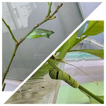 蝶の幼虫とさなぎが、すくすく成長しています。