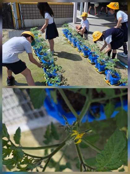ミニトマトが、ぐんぐん成長しています。 2年生のお世話にも力が入ります!