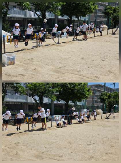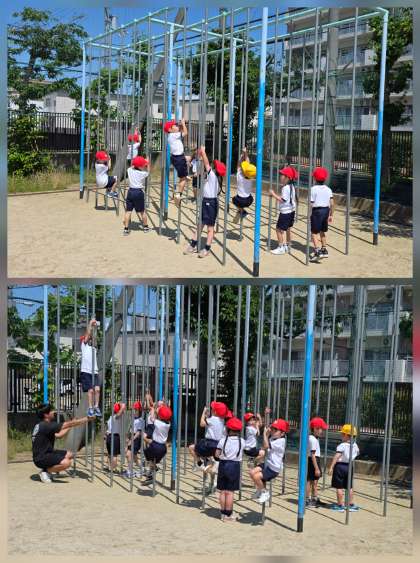 鉄棒・のぼりぼうを使った運動遊びで、楽しく体力向上中の1年生です。