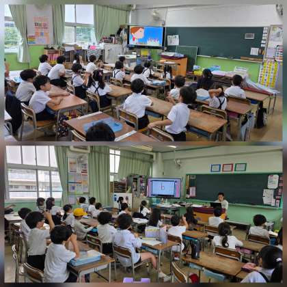 1年生は、誕生日の日が題材の物語を見て英語表現を真似ています。