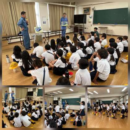 多目的室では、分別回収やリサイクルの大切さを教えてもらい、段ボールを使った空気砲ゲームをしたり、ゴミについてのクイズをしたり、楽しく学びました。