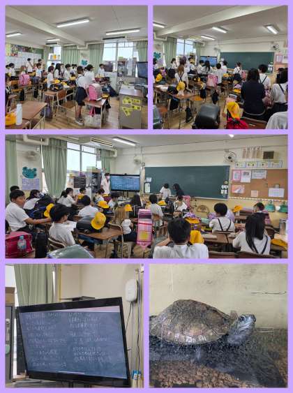 学級の一員である亀のカメゴンも、首を伸ばして参加しています。