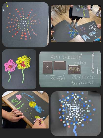 夏の風物詩のひとつ「花火」を、綿棒と絵の具を使って黒画用紙に打ち上げました。