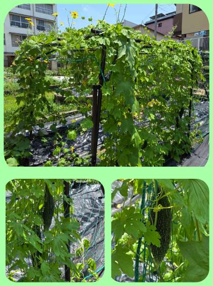 4年生が、理科の学習で育て観察しているゴーヤです。 太陽の光を浴びて、大きく実っています。
