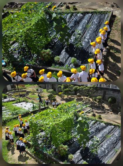 教室裏にある学習園には、見上げるほどの高さにのびたヒマワリや、ゴーヤ、ヒョウタンがあります。