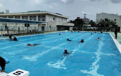 子どもたちは、自分の記録を更新しようと一生懸命に泳いでいます。