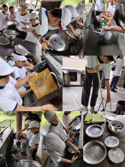 調理用具や食器を、みんなで協力してきれいに片づけます。