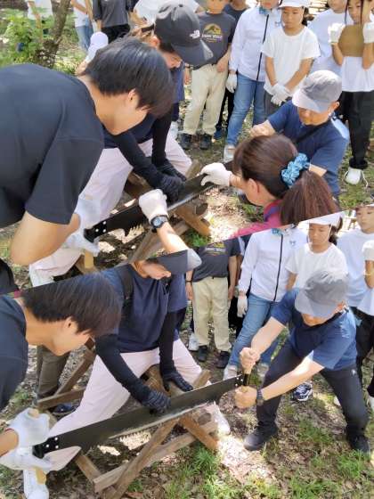 薪割り体験【両引のこぎり】 先生が見本をみせます。