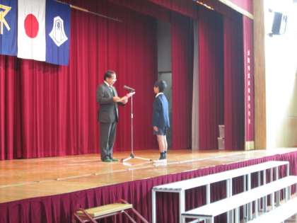 校歌を元気よく歌った後、5年生の代表の子どもがステージに上がり、校長先生から『修了証』を受け取りました。