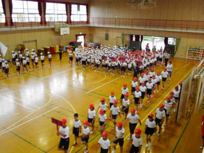 9月23日(金)、どんよりとした曇り空。運動会に向けての全体練習 は、グランド状態が不良のため体育館での練習となりました。開・閉会式、行進、応援合戦、たてわり活動競技などの練習を行い、最後の全体練習が終了。後は当日を待つばかりです。