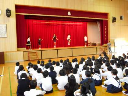 10月27日(木)、学習園から、もずのかん高い声がひびいてくる朝。体育館では児童集会が始まりました。今日は「なわとび週間」中なので、スポーツ委員会のメンバーが「なわとびの技」を発表します。「前とび」から始まり「交差とび」「二重とび」などなど。次ぎ次と発表される技に、大きな歓声と拍手がおこりました。