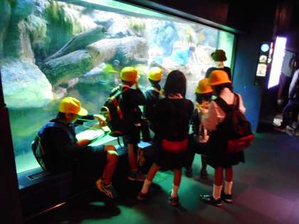 11月11日(金)、昨日の寒さも和らぐ中、3年生が海遊館に向けて出発します。到着するとすぐに「海遊館アカデミー」の開始。飼育員さんから、餌の鮮度のチェック、動物の体調管理など、飼育係の仕事内容を聞き取りました。その後は、班単位で海遊館の中をまわりながら、ワークシートをもとに学習を進めます。外国からの観光客や一般客で混み合っていましたが、班長の指示のもとまとまりのある行動がとれていました。昼食終了後、潮風をうけながらベイエリアを歩き学校へ戻りました。