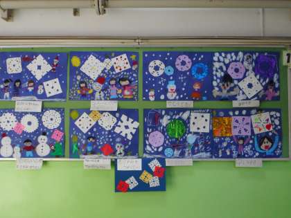 1年生 折り紙をはさみで切り抜き、冬の風景を描いた作品