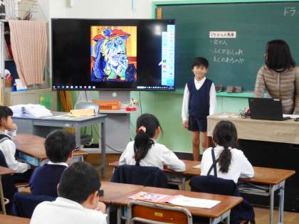 2月3日(金)3限、2年2組図画工作科の研究授業。授業のタイトルは「どうしたんだいドラ・マール!?」。ピカソ作『ドラ・マールの肖像』を鑑賞後、同じ人物を描いた絵『泣く女』を鑑賞し、ドラ・マールさんの心情や絵の背景を考えて、作品の題名をつけるまでが学習の流れ。