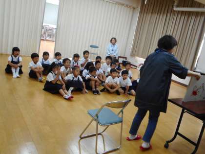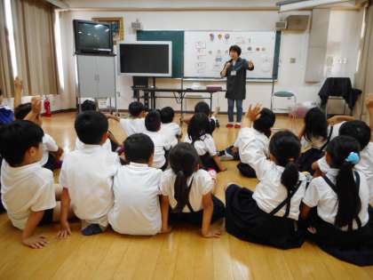 5月31日(水)、平野図書館よりボランティアの方々に来校いただき、絵本の「読み聞かせ」をいただきました。2限が1年2組、3限が1年1組です。紙芝居や大きな絵本を含めて5冊の読み聞かせに、児童たちは絵本の世界に入り込んでいきます。絵本「うえへまいります」では、読み聞かせの後、クイズ形式で内容を思い返していきます。集中して聞いているのでよく覚えています。「45階、お相撲さんの階で僕が買った物は?」一度たずねてみてください、まだ記憶に残っているかも?