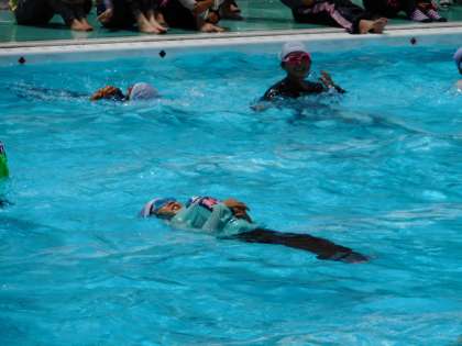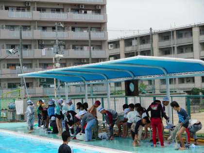 7月12日(水)3限、水泳のインストラクターに来校いただき「着衣泳」について学びました。最初は、水に落ちた友だちの救助方法。近くに浮きそうな物があれば、自分が助けるのではなく投げ入れる。もし、自分の場合は、水着を着用している場合と異なり、服を着たままでは思うように泳げない。その違いを理解します。ペットボトルを長袖の胸・お腹あたりに入れて上向きに浮く。何もない場合は、長袖に空気を入れてふくらませて浮く。水辺の事故。いつ、どこで出くわすかわかりません。自分や仲間を守る方法を学びました。