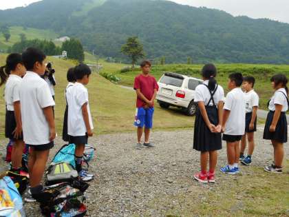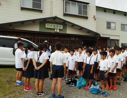 林間学習でお世話になる宿舎の前で「開舎式」が始まります。児童の代表が「自然に親しみ、仲間と協力して2泊3日の林間学習を頑張りますので、よろしくお願いします」と、あいさつをしました。いよいよ現地での活動がスタートです。