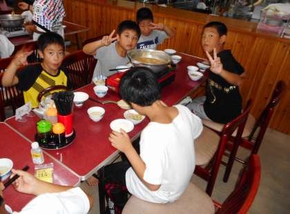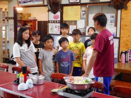 7月23日(日)午後、入浴後、全員元気に食堂に集合し「夕食」です。しっかり活動したのでお腹はペコペコ。食事係の「いただきます」と同時に夕食開始。今日のメニューは「豚みそなべ」です。「ワィワィガャガャ」みんなで楽しく食べる夕食は最高の味でした。