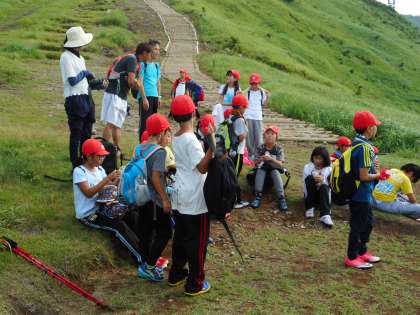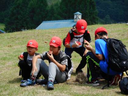 7月24日(月)朝、林間学習2日目の朝は少し曇り空。ラジオ体操・朝食を済ませ、鉢伏山登山の開始。混雑を避け午前8時スタート。鉢伏山は標高1200mほどの稜線がきれいな山。風は涼しいですが、汗がふき出てきます。でも、頂上に着いた時の達成感とその景色は最高。自然の雄大さ・素晴らしさを感じる眺めです。往復約2時間かけて宿舎前に到着。みんなで食べた冷えたスイカは、格別のおいしさでした。