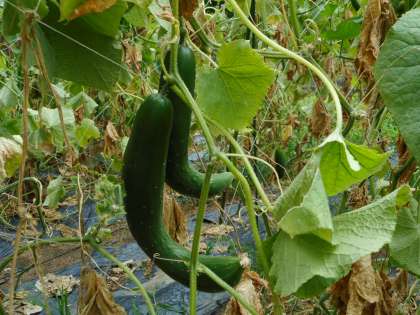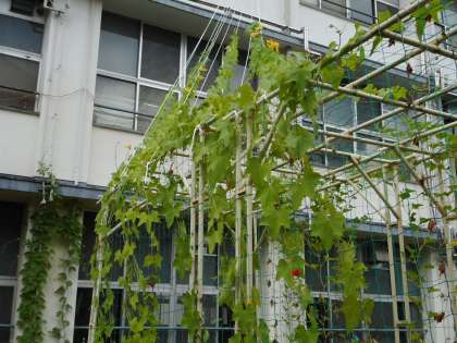 7月27日(木)、夏休みが始まり7日目。1学期に栽培していた学習園の植物は大きく育っています。4年生の理科の観察用のヘチマは、ひもに巻き付きながら上へ上へ。5年生のキュウリは青々と、2年生のプチトマトは赤々と実っています。