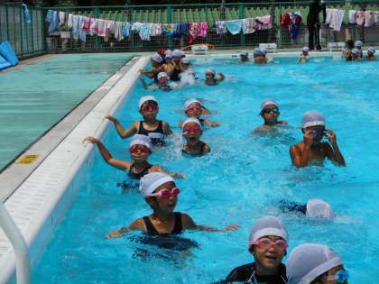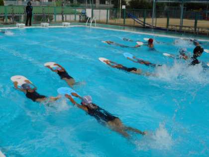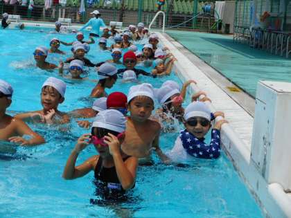 7月31日(月)午前、連日猛暑日が続きます。夏休みが始まり10日ほどが過ぎ、「プール開放」への参加者は最初に比べると少し減ってきました。それでも100名ほどの子どもたちが参加し、水と親しんでいました。